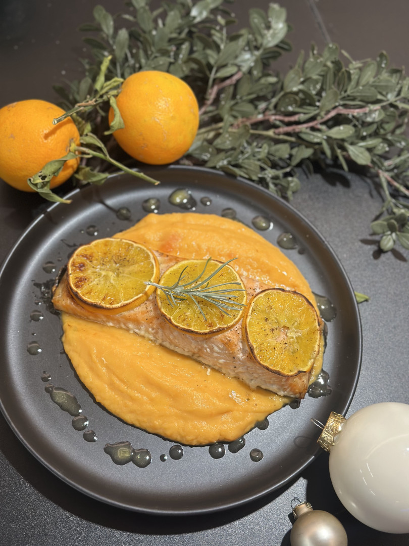Na talíř si naservírujeme batátovou kaši, na ni položíme upečeného lososa s karamelizovanou mandarinkou a celé jídlo přelijeme citrusovou glazurou 🍽️.
