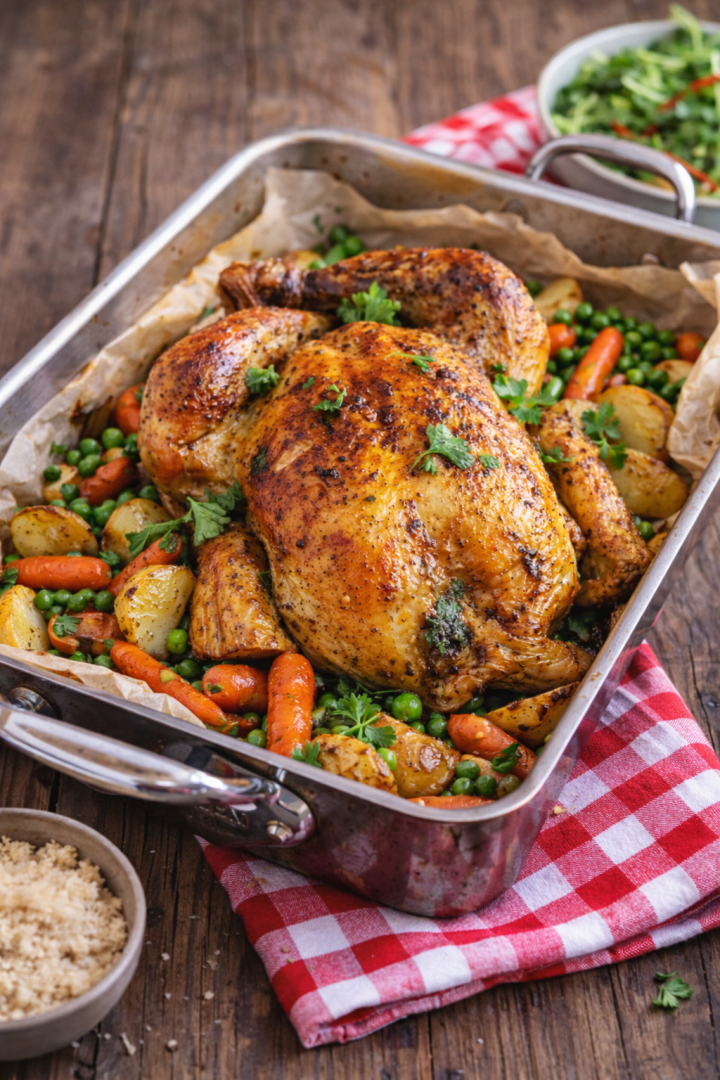 💡 Tip na podávání: Pečené kuře výborně chutná s jednoduchým zeleninovým salátem nebo čerstvým chlebem, kterým si vychutnáš každý kousek výpeku.