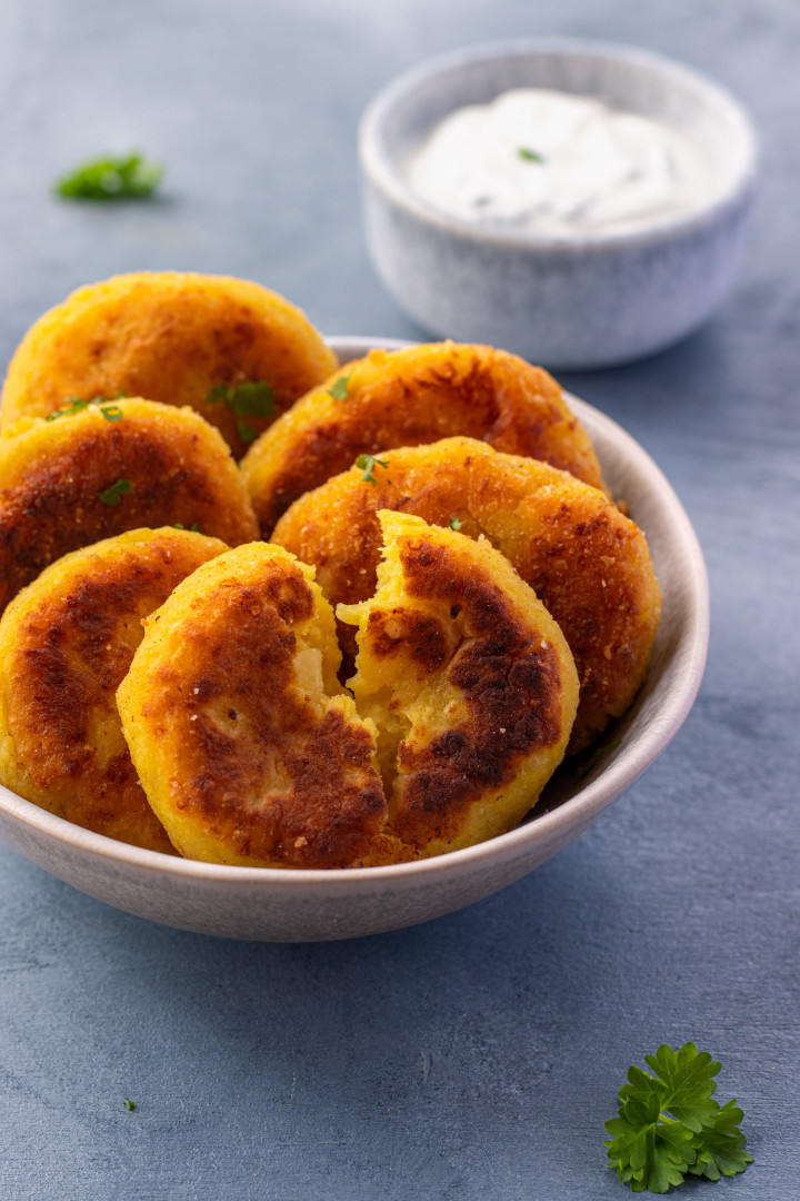 Tyto placky jsou skvělým způsobem, jak zužitkovat bramborovou kaši a zároveň si dopřát chutné, syté a výživné jídlo. Placky se plní mozzarellou a podávají se s osvěžujícím jogurtovým dipem s citronem a petrželovou natí.